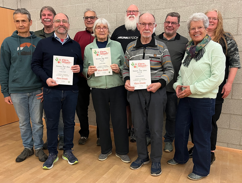 Mitgliederversammlung 2026: Drei Jubilare freuten sich über ihre Ehrung, die gewählten Vorstands- und Turnratsmitglieder bildeten den passenden Rahmen. Von links: Thomas Heimann (Kassenprüfer), Bernd Kaiser (Pressewart und Ballspielwart), Frank Schmidt (40 Jahre), Peter Sassenscheidt (Oberturnwart), Gerda Schönig (60 Jahre), Heiko Schmerbeck (Geschäftsführer), Fritz Spickenheier (80 Jahre), Thomas Pitzer (2. Vorsitzender), Elke Paff (Frauenwartin) und Kirsten Schmerbeck (Gesundheitssportwartin).