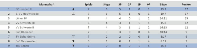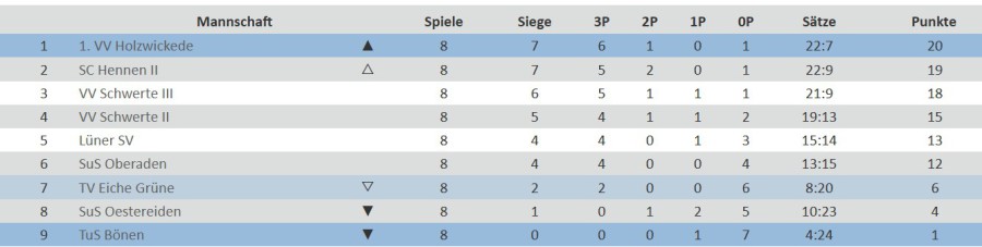 Mit nur einer Niederlage ist der Meistertitel hochverdient, kam aber dennoch überraschend, da der Rückstand auf den bis dahin verlustpunktfreien Spitzenreiter VV Schwerte nach der Hinrunde bereits auf fünf Punkte angewachsen war. Unsere Mannschaft gab in der Rückrunde aber nur noch einen Punkt ab, während Schwerte nicht nur beim 1:3 in der Saathalle sondern auch gegen die starke SG Boelerheide unterlag. Dadurch rutsche der TV Eiche am drittletzten Spieltag unverhofft auf die Poleposition und gab diese auch nicht mehr her. Schwerte III sicherte sich durch einen abschließenden Sieg den zweiten Platz und die Teilnahme an der Aufstiegsrelegation. Wir wünschen „Viele Erfolg“!