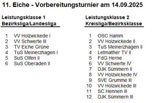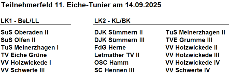 Der TV Eiche wird als Gastgeber mit zwei Teams vertreten sein, außerdem sind mit dem Letmather TV, dem SC Hennen und zwei Teams der DJK Sümmern gleich vier weitere Mannschaften aus Iserlohn dabei.